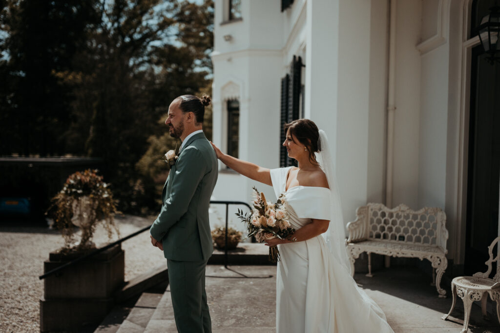 Kiezen jullie ervoor om de first look voor de ceremonie te doen? Zo plan je dit het beste; de bruidegom gaat op een mooie plek staan en draait zich om. De bruid komt aangelopen en tikt de bruidegom op zijn schouder. Hij draait zich om en ziet haar voor het eerst staan..