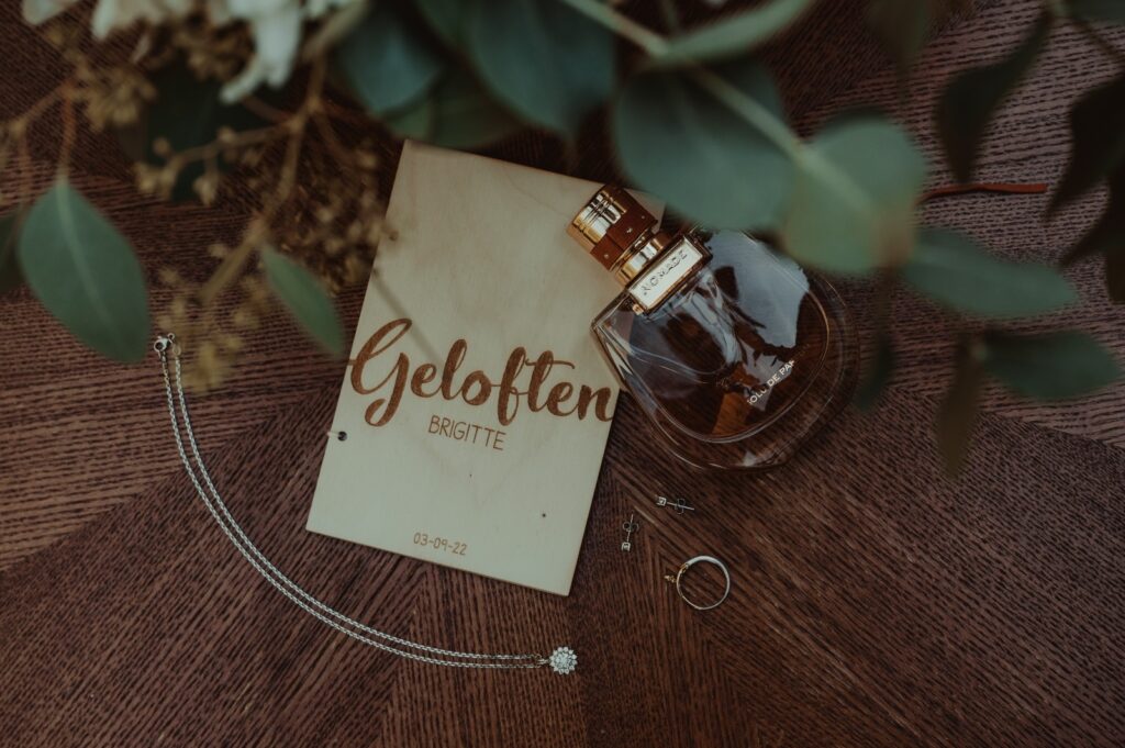 Tijdens de bruiloft zelf zijn er momenten genoeg voor mooie detailfoto’s. Denk hierbij aan de taarttopper, jullie gastenboek, gegraveerde attributen en het bruidsboeket wat ergens mooi in een vaas staat of ligt.