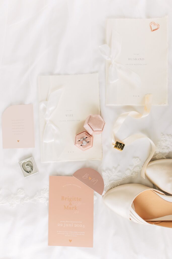 Aan het begin van de dag, tijdens het aankleden hebben de fotografen tijd voor de mooiste detailfoto’s. Denk hierbij aan de trouwjurk ergens mooi hangend. En een flatlay, dat is een foto van bovenaf van de stationery. Nog zo’n moeilijk woord, het is al het drukwerk, dus de Save the date, uitnodiging en gelofte kaartje bijvoorbeeld. Neem hier dus ook zeker allemaal een extra kopie van mee. Deze kan de fotograaf dan mooi neerleggen, met je sieraden, parfum, sluier en schoenen erbij.